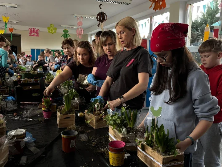 Na osiedlu Azoty świąteczne dekoracje powstawały przy stołach pełnych farbek, gałązek i wiosennych dodatków. Zamiast pośpiechu była cierpliwość, a zamiast gotowych ozdób – własne kompozycje z pisankami, zajączkami i kwiatami. Podczas warsztatów wielkanocnych dzieci i dorośli pracowali razem, a sala szybko wypełniła się kolorami i rozmowami.
