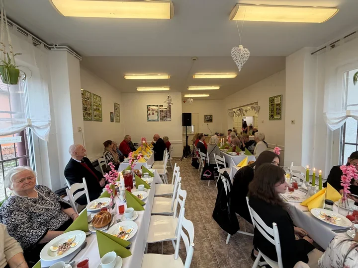W Domu Dziennego Pobytu nr 2 atmosfera świąt nie skończyła się wraz z niedzielnym stołem. Podczas wielkanocnego spotkania w „Magnolii” było miejsce na wspólny posiłek, modlitwę i życzenia, które nadały wydarzeniu ciepły, rodzinny rytm. Obok gospodarzy pojawili się samorządowcy, młodzi chórzyści i wolontariusze, a całość miała wyraźnie wspólnotowy charakter.